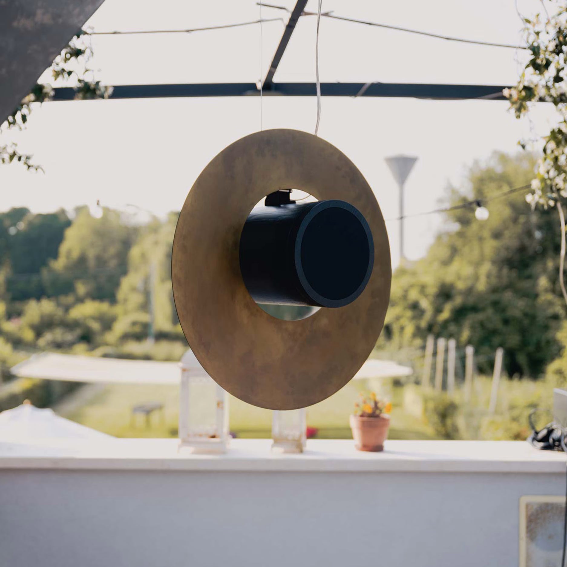 Saturnia flying è l’evoluzione naturale di un’idea che già guardava alle stelle. Una versione sospesa di Saturnia, pensata per librarsi nello spazio con eleganza grazie a due cavi in acciaio che la tengono ancorata solo all’essenziale. Come un pianeta in levitazione, Saturnia Flying sembra sfidare la gravità, amplificando non solo il suono, ma anche la percezione di leggerezza e meraviglia.