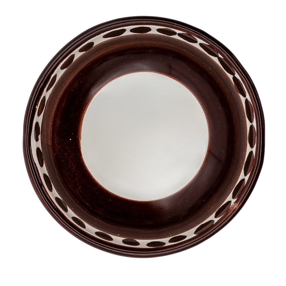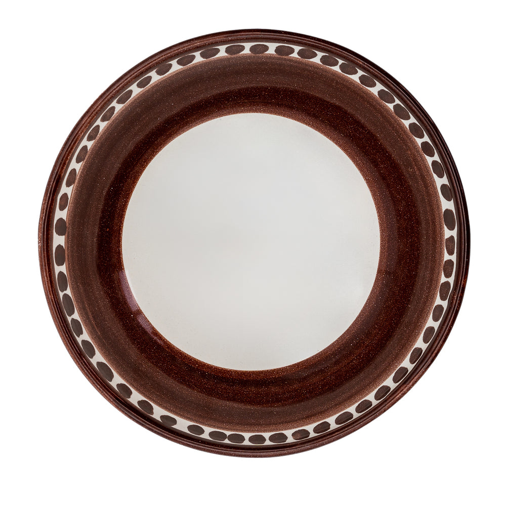 Il bordo colorato crea un contrasto armonioso con il bianco, accompagnando ogni pietanza e conferendo ritmo visivo alla tavola. La tonalità calda del marrone richiama sensazioni naturali e accoglienti, adatta a contesti informali, tavole quotidiane o momenti più curati, integrandosi con facilità in cucine moderne, rustiche o minimaliste.