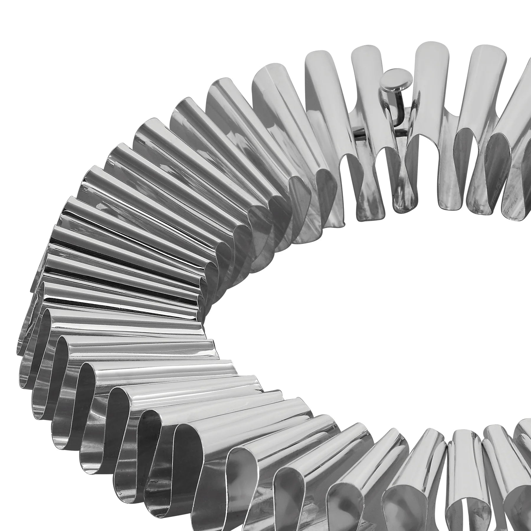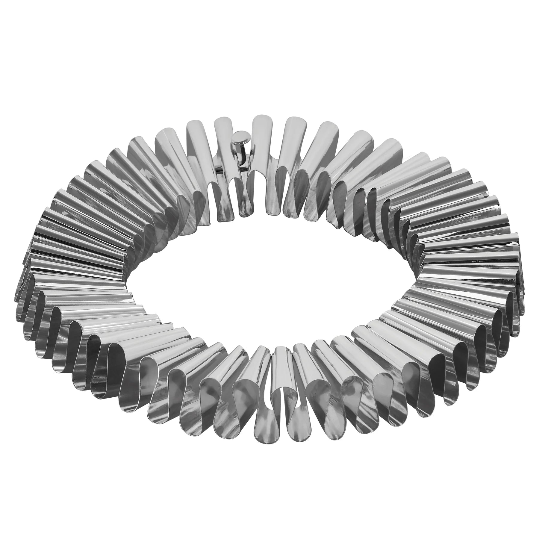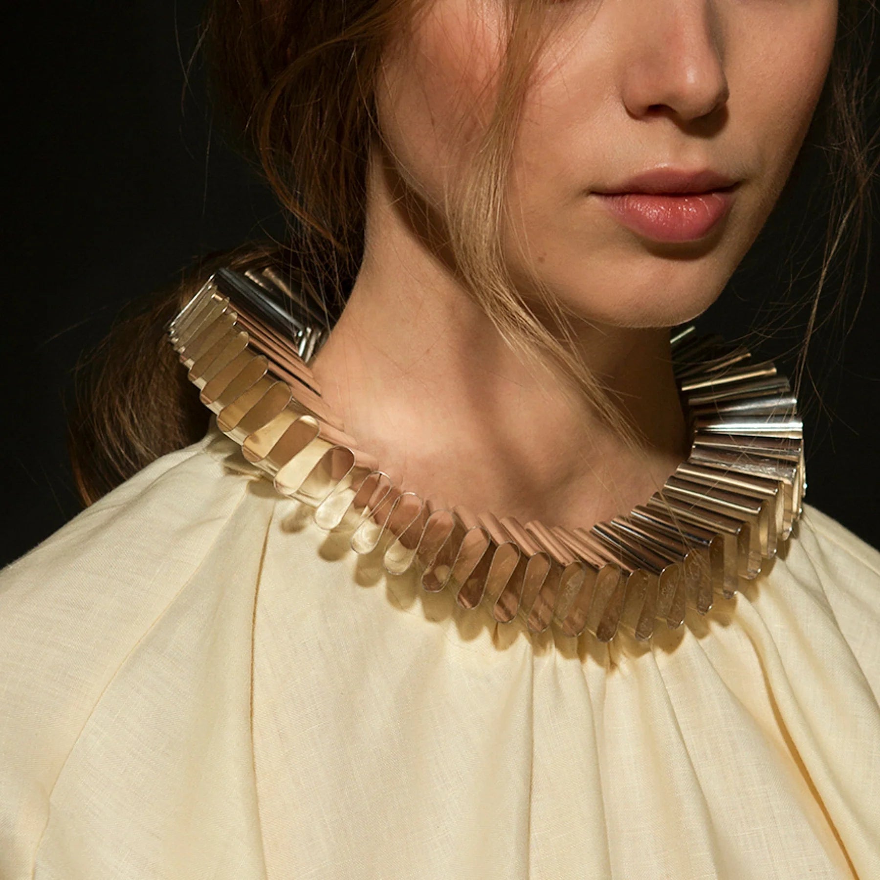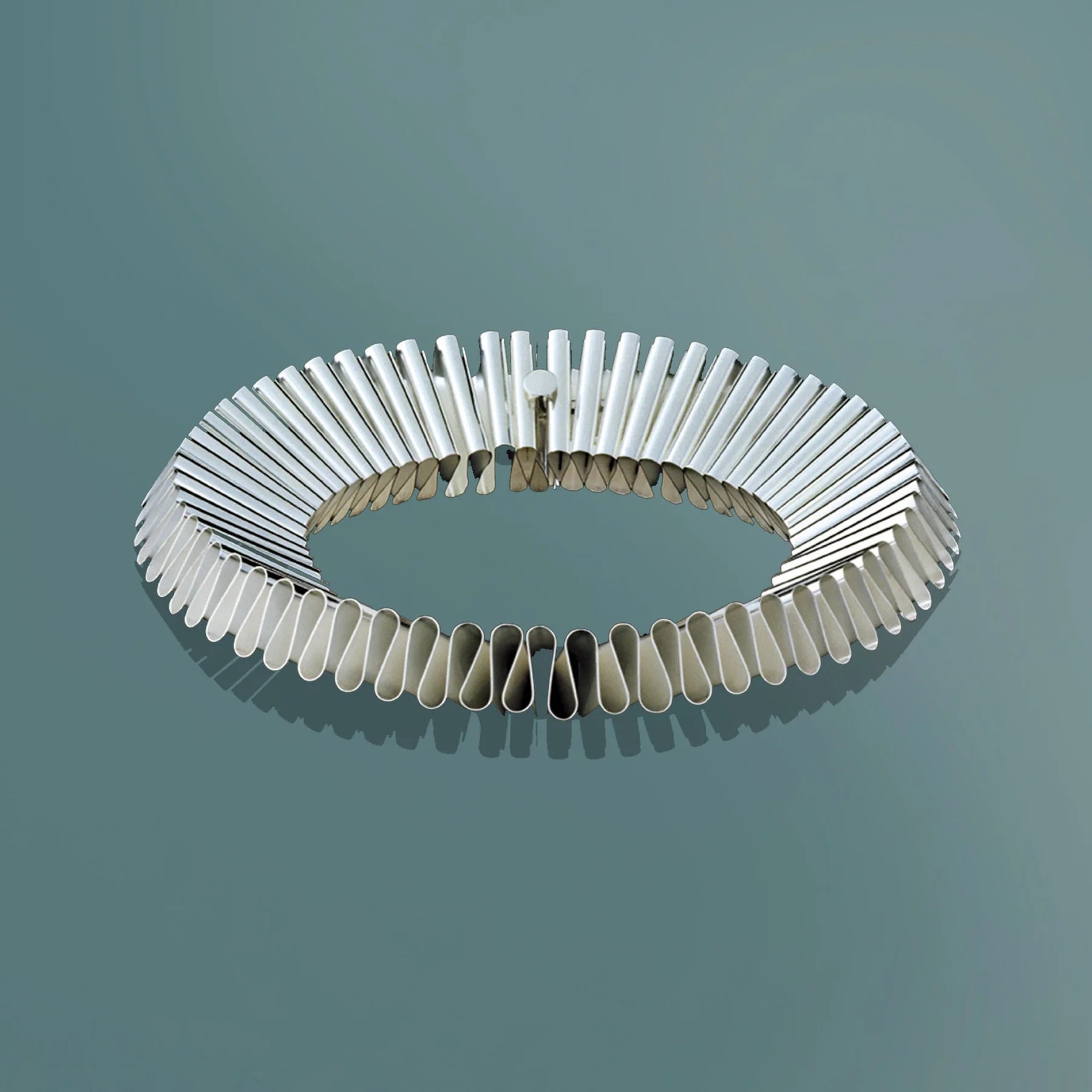 Lella Vignelli ha creato una sorta di collare elisabettiano, piegando l'argento come un plissé. Un gioiello imponente per una persona dalla personalità decisa, capace di rendere regale anche un telo di sacco. Non una semplice collana, come accessorio, ma un elemento anatomico capace di cambiare il portamento di chi lo indossa. Argento, luce, modularità, potenza della linea.