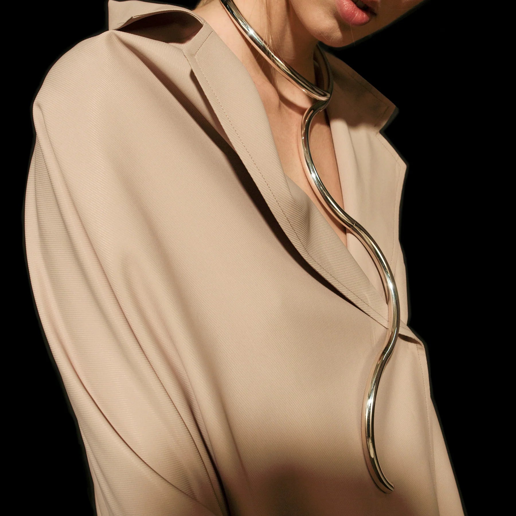 Un tubo con profilo rotondo in argento sterling con giunture invisibili. Una collana che può essere completamente attorcigliata, stesa e allungata, assumendo un'ampia varietà di figurazioni.