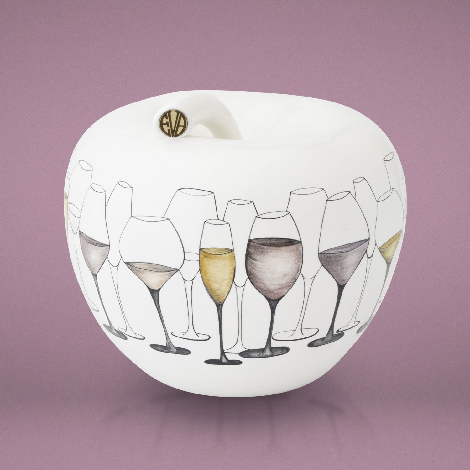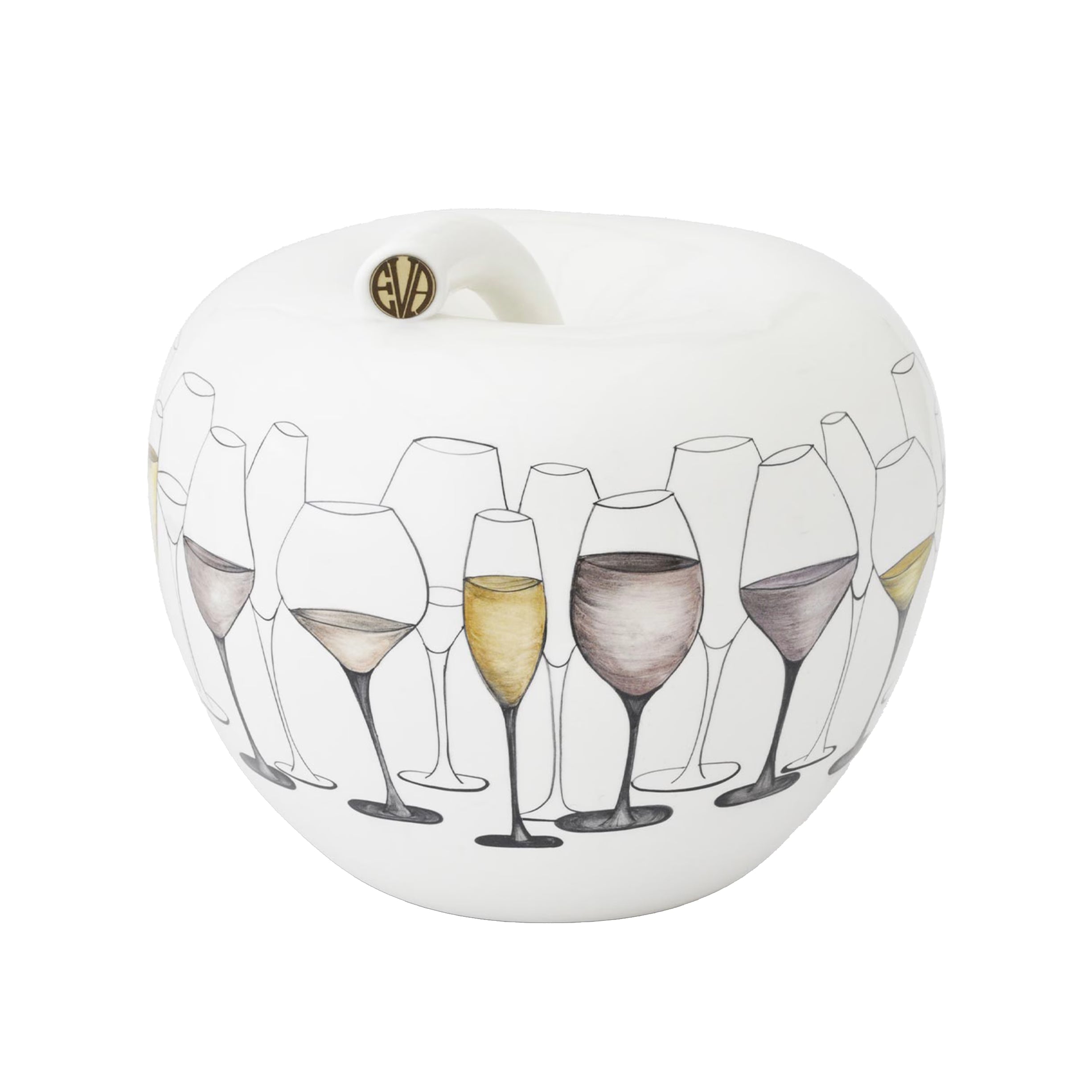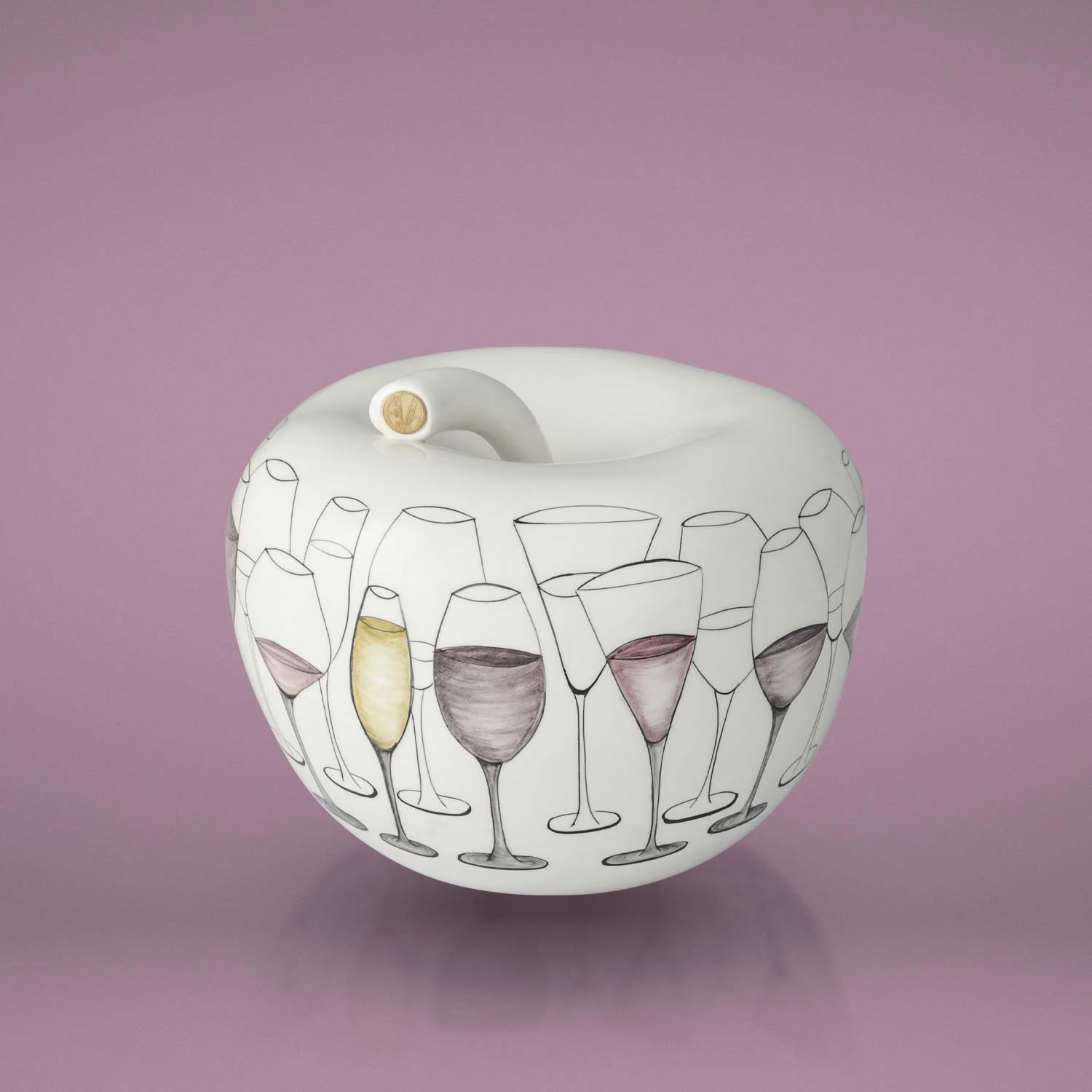 Salvadanaio a forma di mela, oggetto di home decor con decorazione calici, ripetibile ma eseguita manualmente dall’artista.