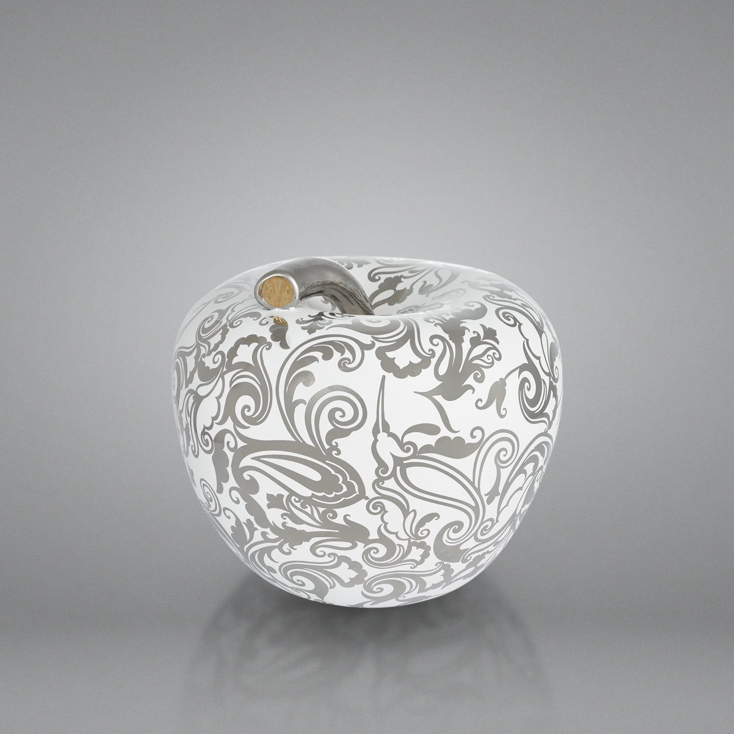 Salvadanaio a forma di mela, raffinato oggetto di home decor con finitura in metallo prezioso e riccioli decorativi realizzati manualmente dall’artista.