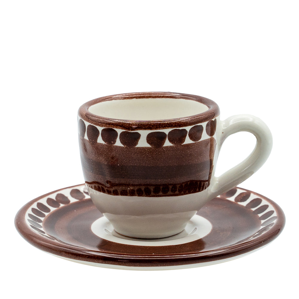 Tazzina da caffè con piattino I Colorati marrone, ceramica artigianale smaltata, vista frontale.