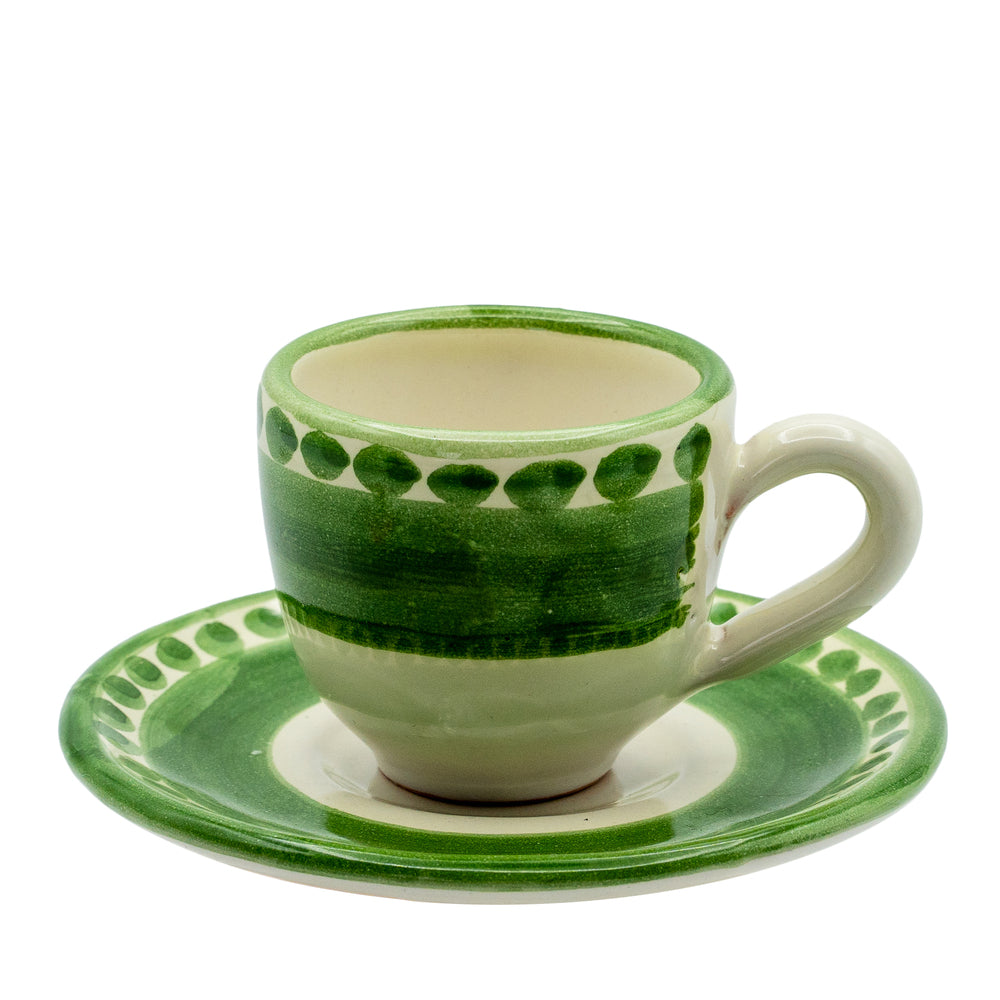 Tazzina da caffè con piattino I Colorati verde, ceramica artigianale smaltata, vista frontale.