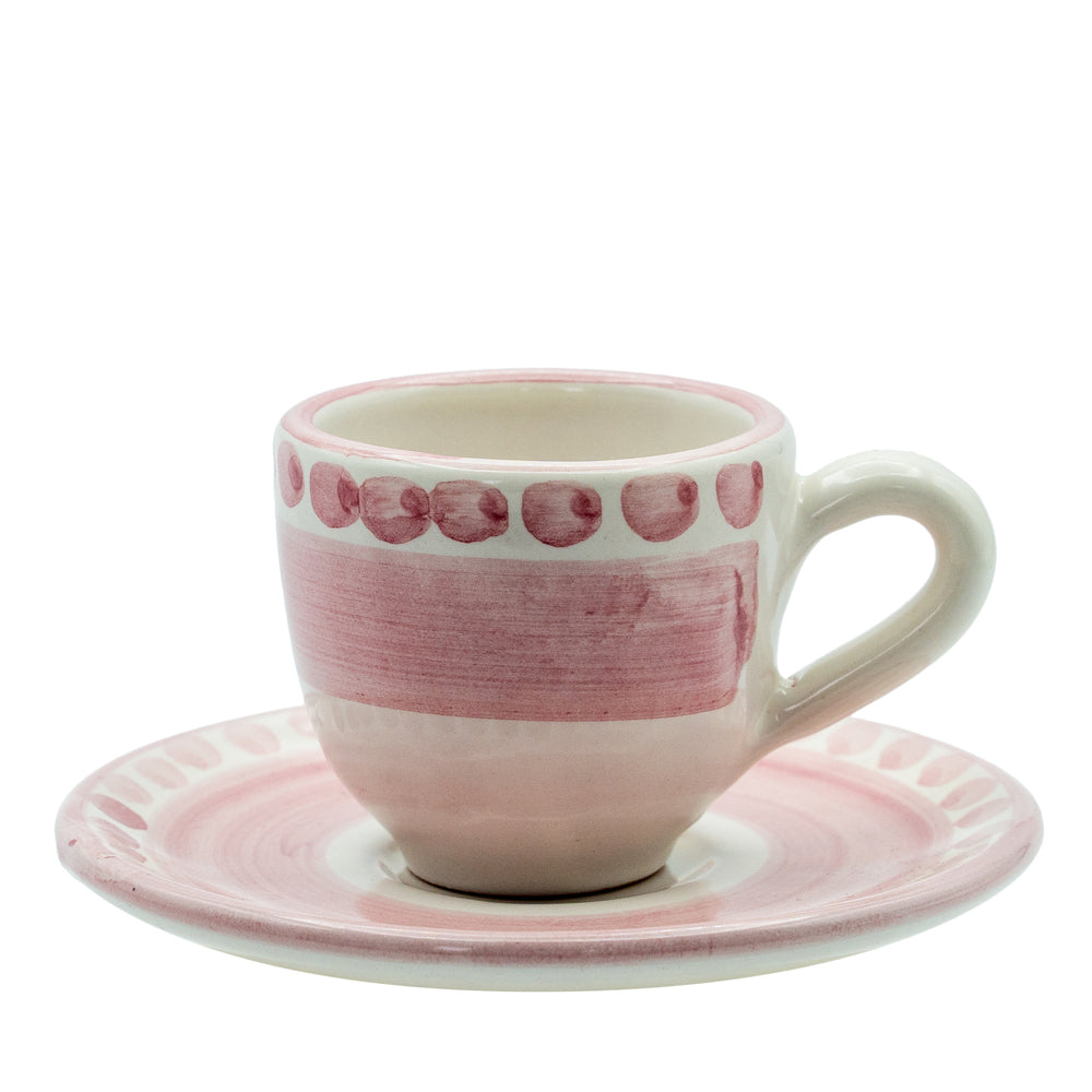 Tazzina da caffè con piattino I Colorati rosa, ceramica artigianale smaltata, vista frontale.