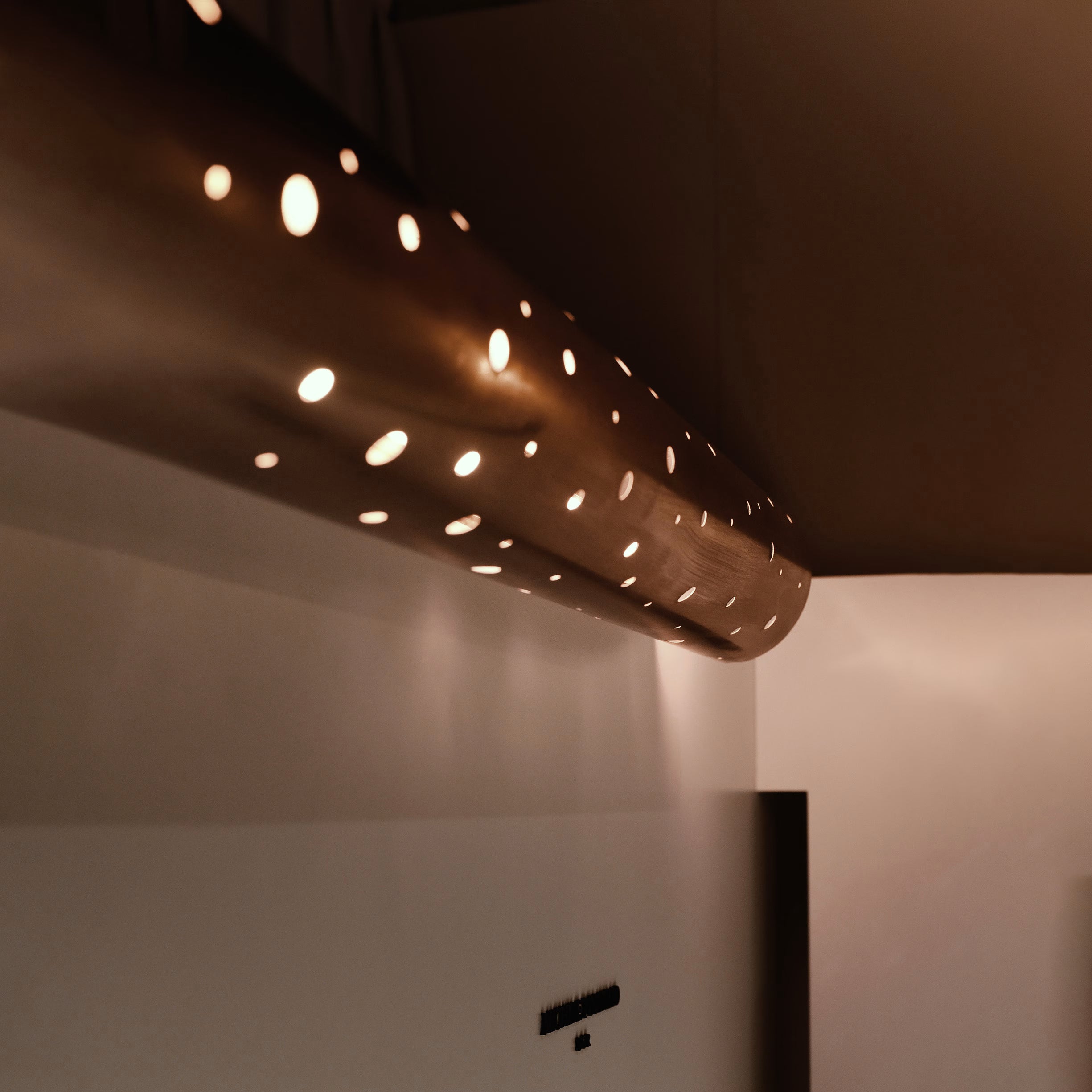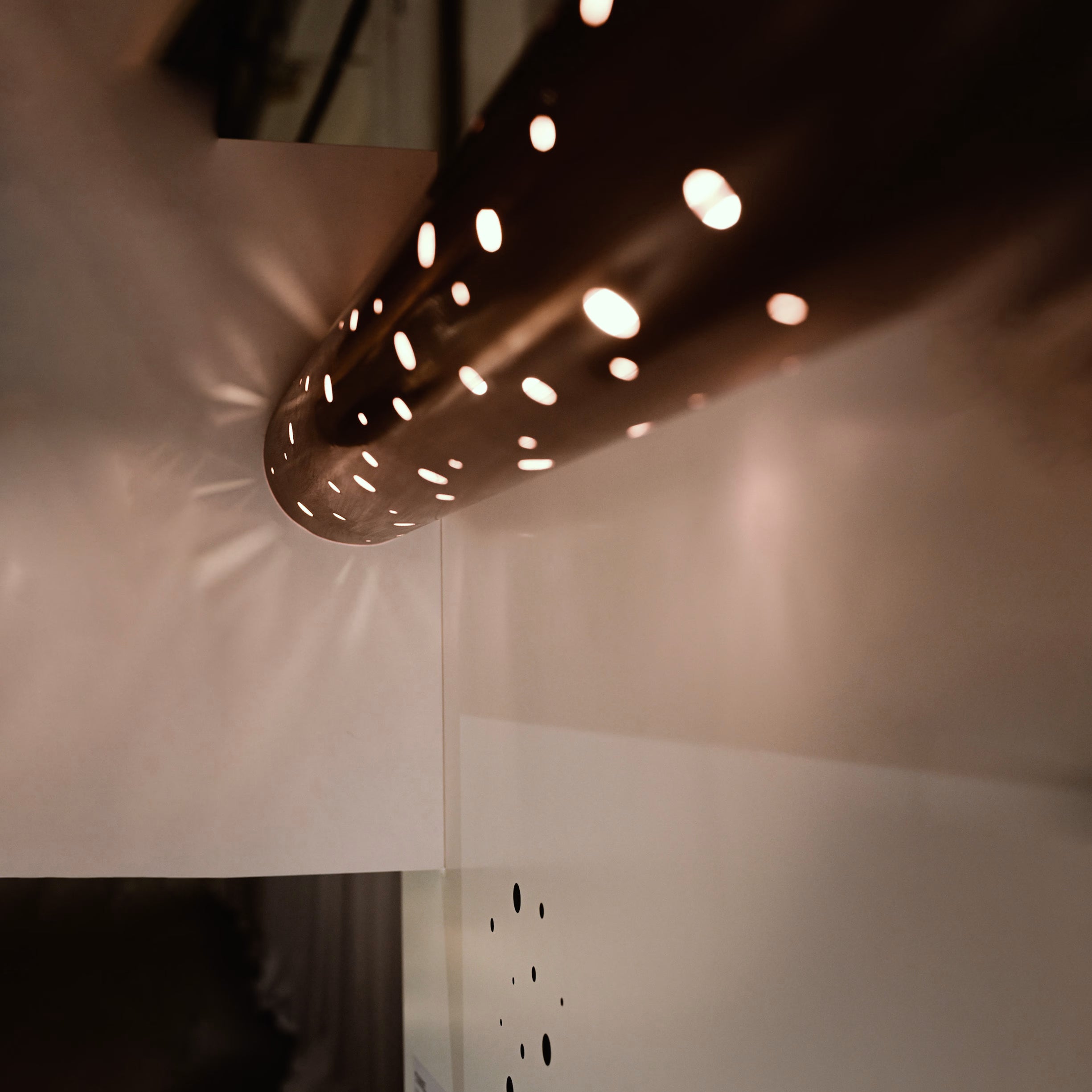 La luce illumina il tunnel metallico da parte a parte, facendosi strada attraverso le fessure nella superficie. I fori di diametro variabile creano un vivace gioco di luci proiettato nella stanza.