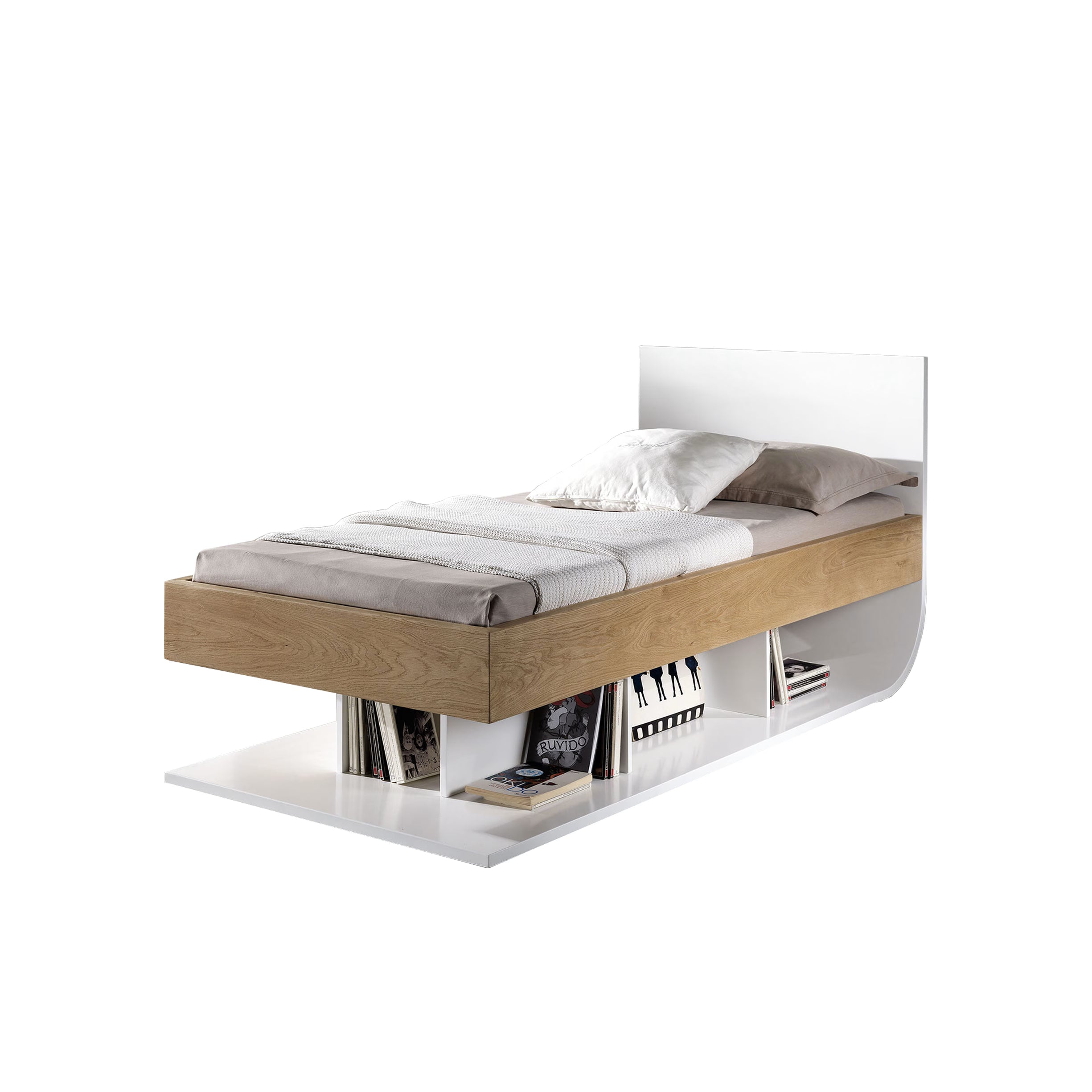 Limbo bed è un letto realizzato in MDF laccato opaco e rovere.