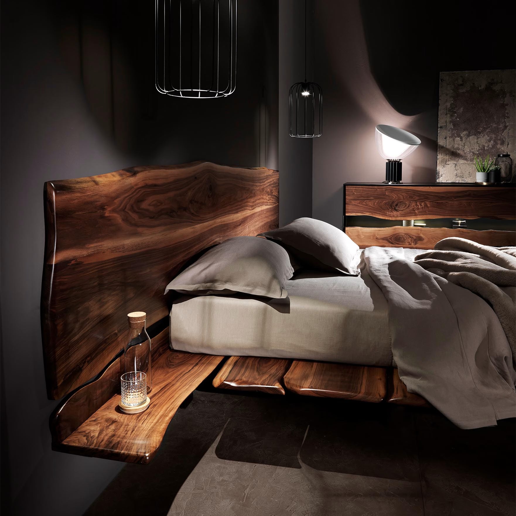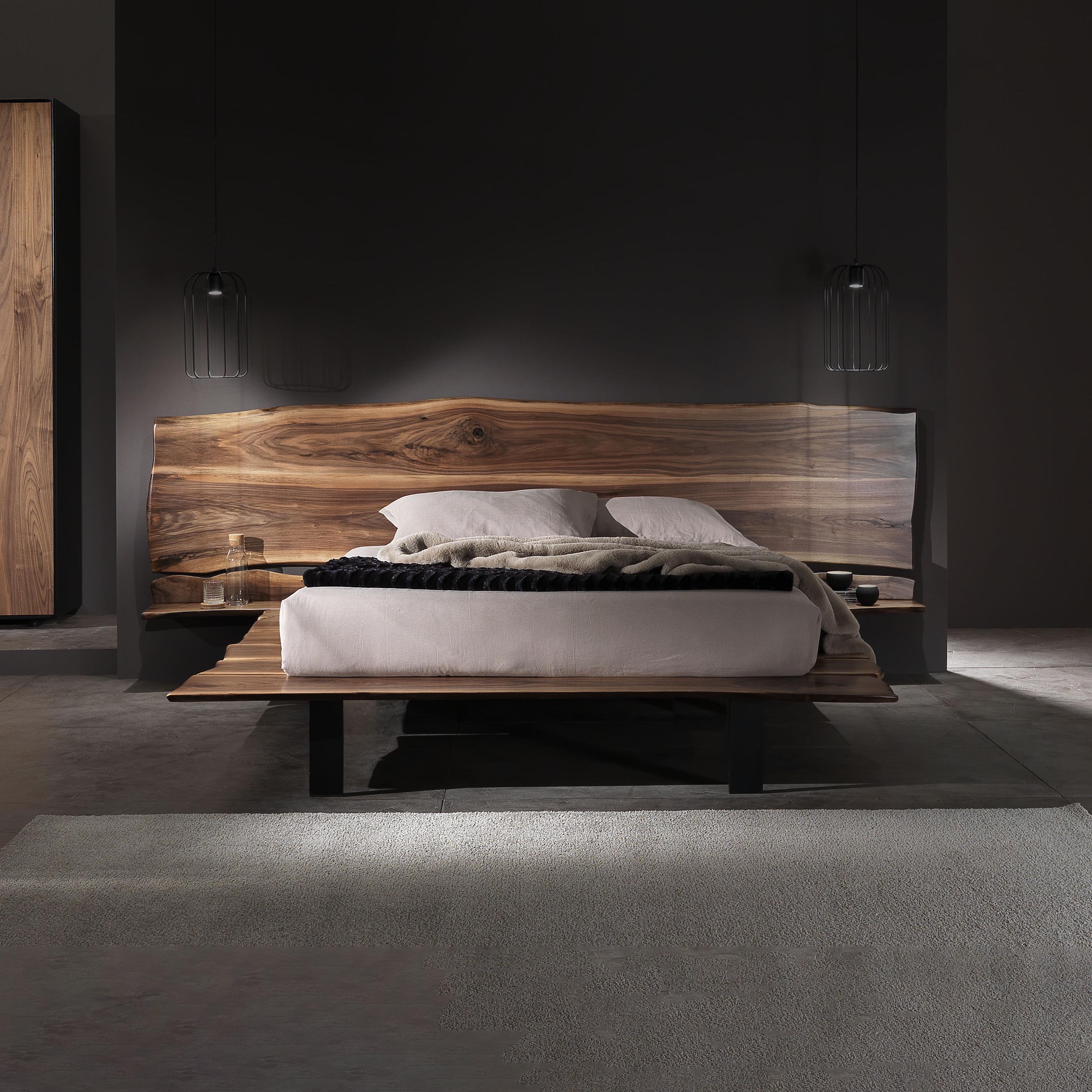 Il letto è composto dall’armonico accostamento delle tavole, si crea così un elemento di grande naturalezza ed unicità.Uno degli elementi caratterizzanti del letto sono senz’altro i comodini integrati nella testata, dettaglio che le consente di avere continuità ed importanza.Le sue importanti dimensioni mettono in risalto la bellezza e l’eleganza del legno conferendogli così una sensazione scultorea e maestosa.