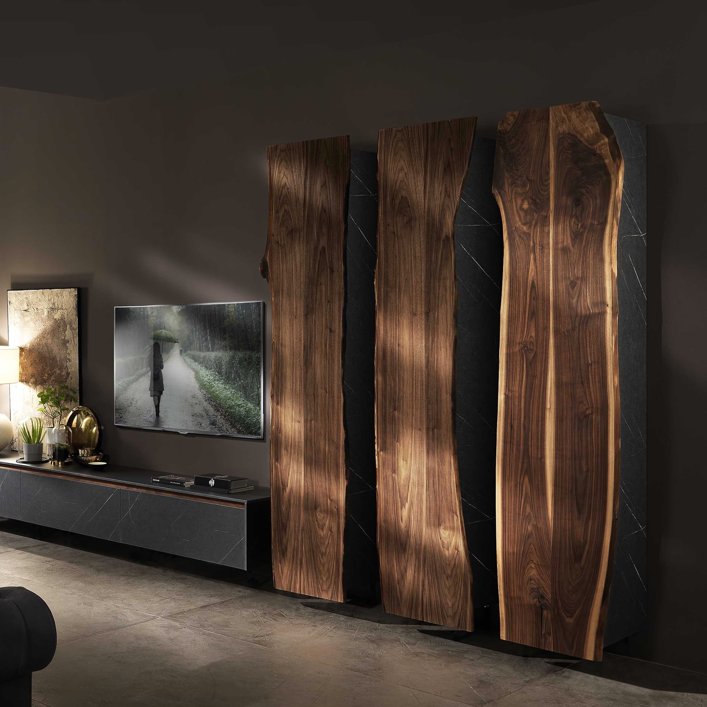 Sistema giorno versatile ed elegante.Si basa sulla possibilità di personalizzare ed assemblare partendo dalle proprie esigenze la composizione più adatta.Il sistema si compone da colonne verticali formate dall’anta in Noce Canaletto (Walnut) e da cassettoni che si sviluppano orizzontalmente in finitura pietra.La combinazione tra i vari elementi naturali, ricchi di pregio ed eleganza, consente di interpretare con stile le funzionalità dei living più ricercati.