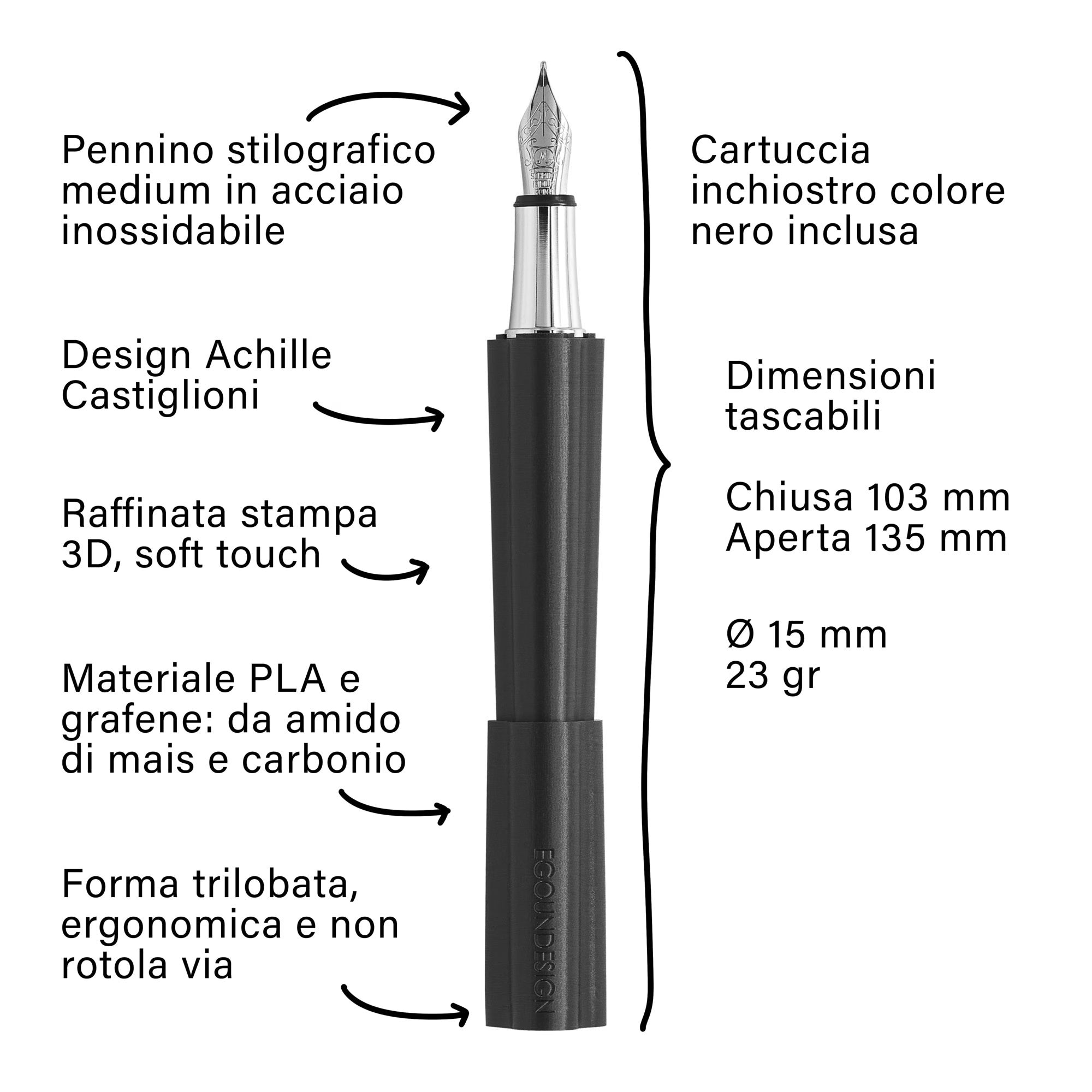Un ulteriore punto di forza del progetto è la ricerca sui materiali. CENTO3 è realizzato con un filamento a base di PLA (acido polilattico) ottenuto da fonti rinnovabili come l’amido di mais, arricchito con grafene, un materiale derivato dalla grafite, composto da uno strato monoatomico di carbonio. Leggero, resistente e altamente performante, il grafene è considerato “il materiale del futuro” per le sue straordinarie proprietà tecnologiche. Oggi CENTO3 è disponibile nei modelli multifunzione CENTO3.E, stilografica pocket CENTO3.G, micromina meccanica CENTO3.O e penna roller CENTO3.R nella colorazione carbonio propria del materiale in grafene.