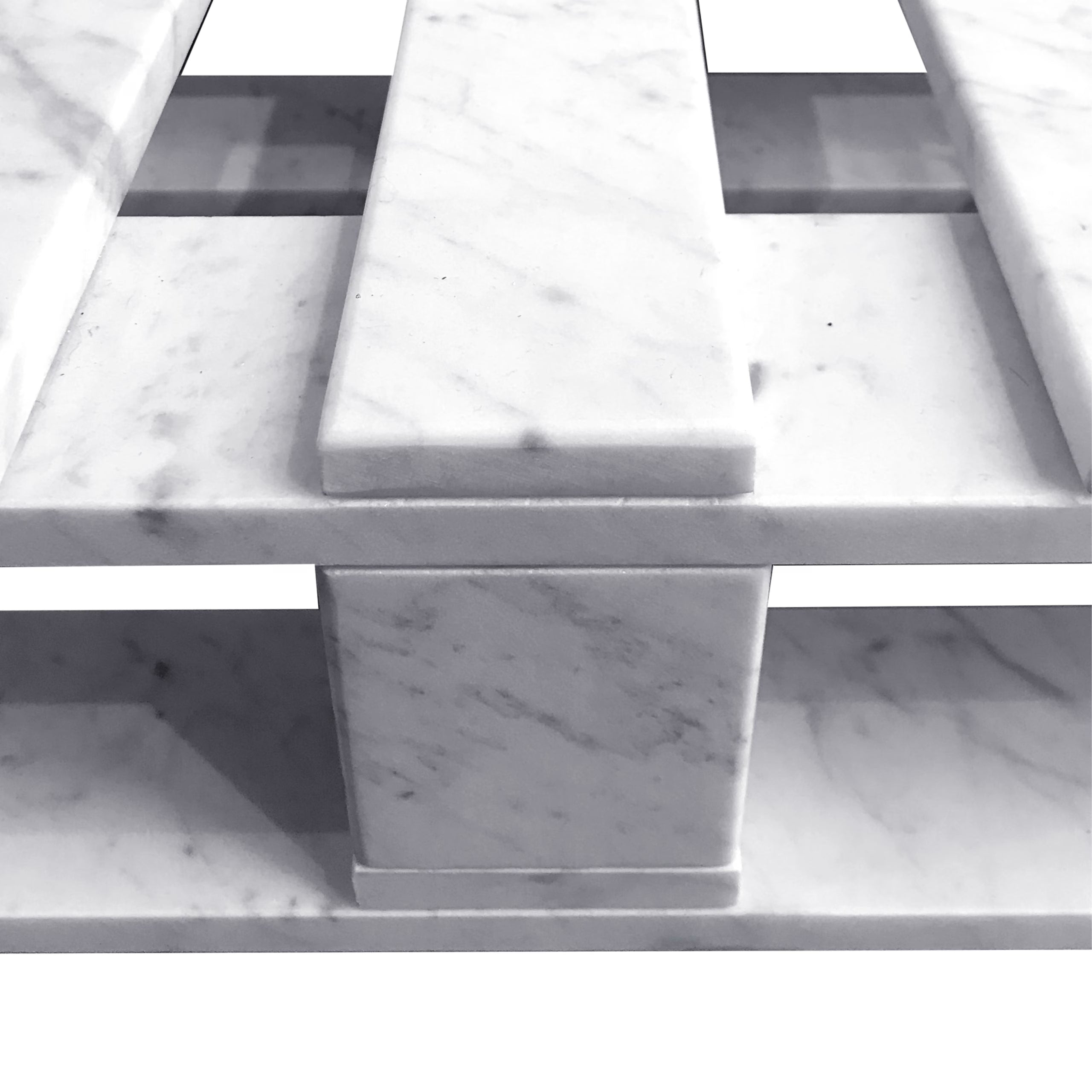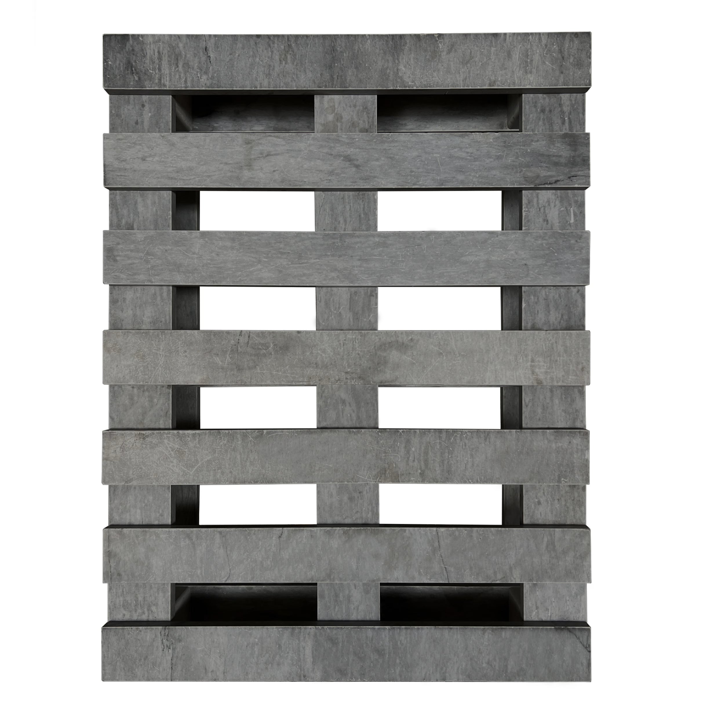 Un complemento d’arredo ispirato alla transizione di cui è protagonista il marmo, in quanto l’attenzione dell’osservatore viene portata indietro nel tempo, nello spazio, facendolo riflettere sulla storia e la vita di quel materiale, che è stato estratto, movimentato, lavorato in fasi progressive, accatastato, abbandonato, e ora riciclato, fio ad arrivare assemblato nella sua nuova compiutezza.