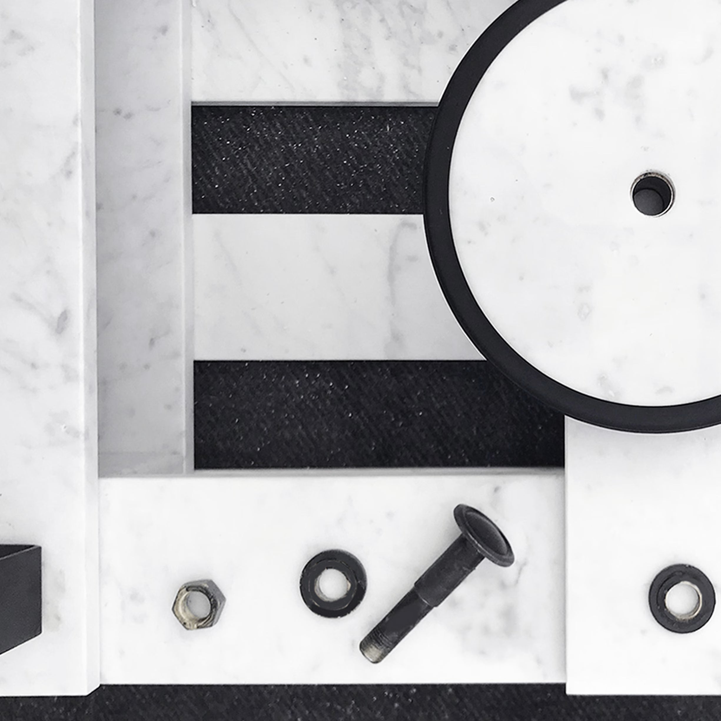 Dettaglio piano tavolino Tellap con elementi in marmo
