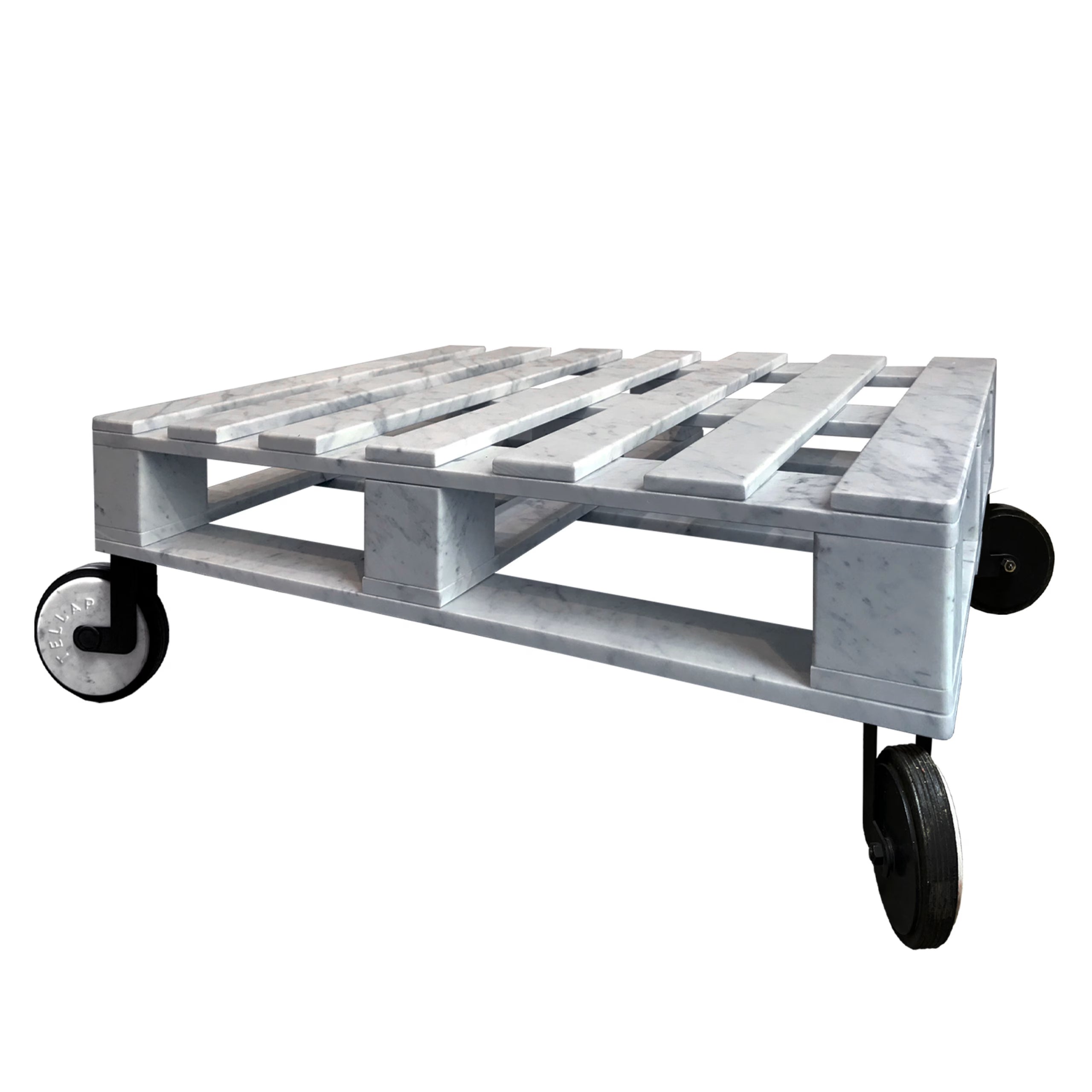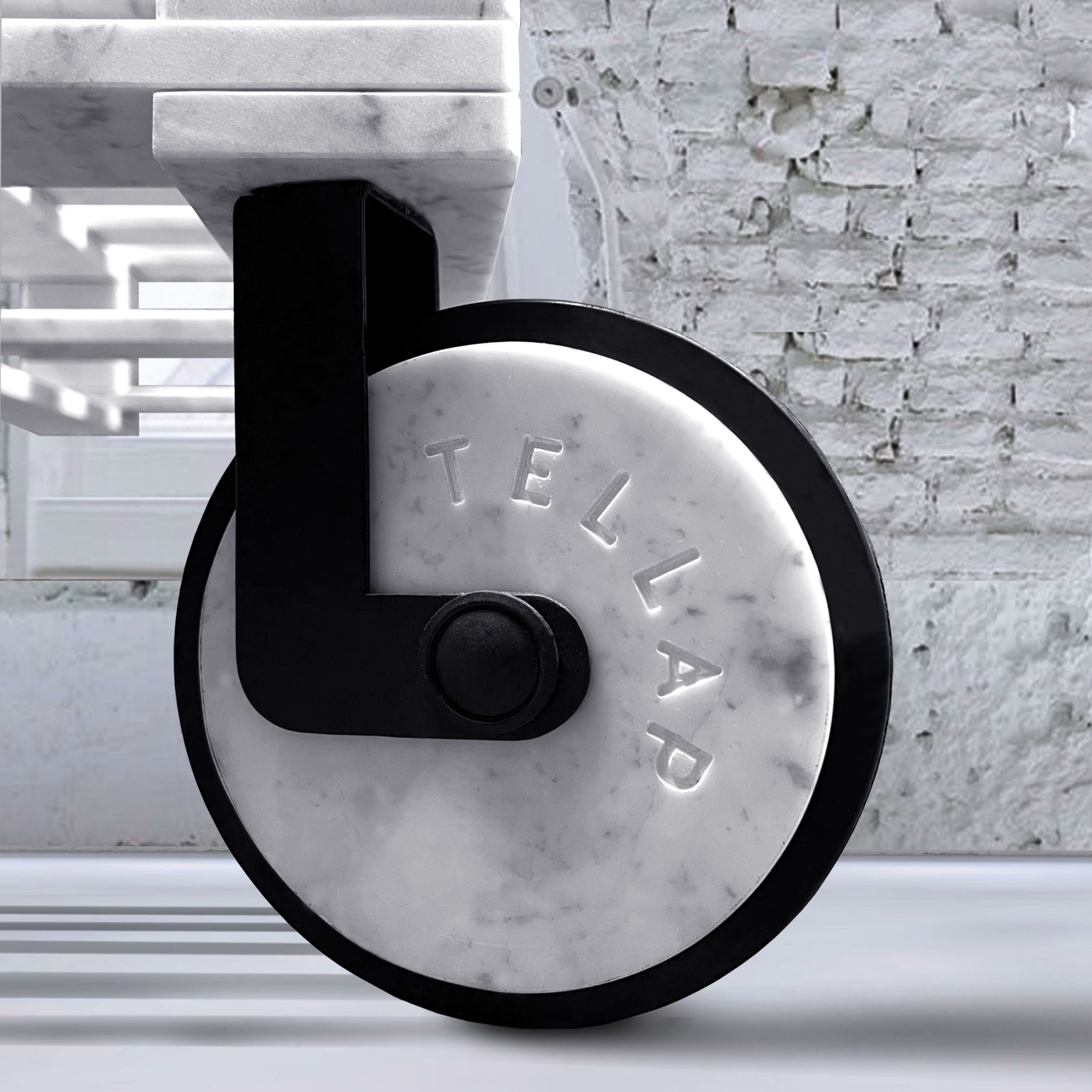Viene qui proposta la versione coffe-table, ovvero completato da una ruota realizzata su disegno in metallo e marmo come accessorio, dandogli così funzionalità di coffe-table, ovvero tavolo da salotto per spazi interni ed esterni. Proposto in finitura in marmo bianco di Carrara, la più iconica ed apprezzata.