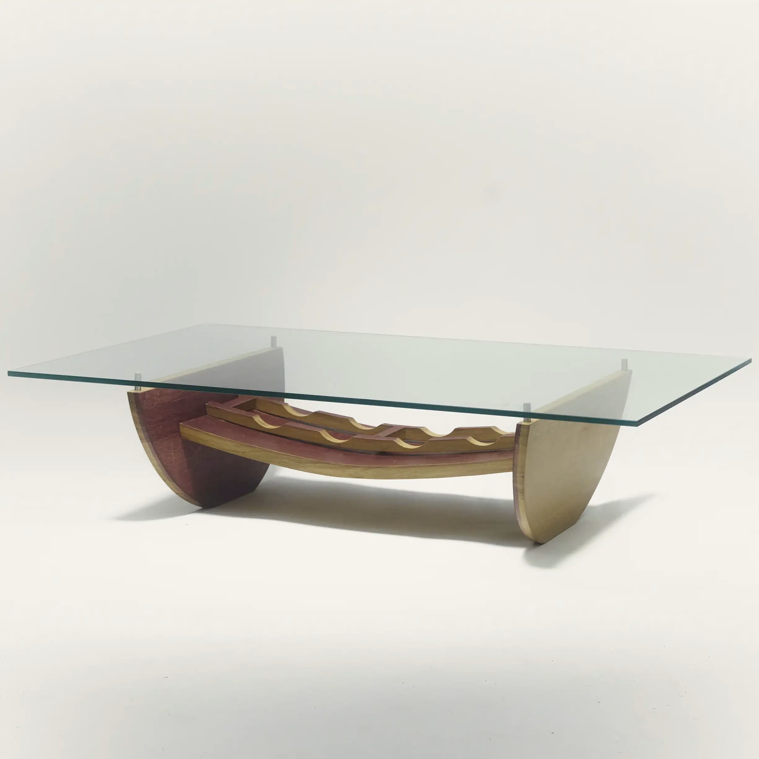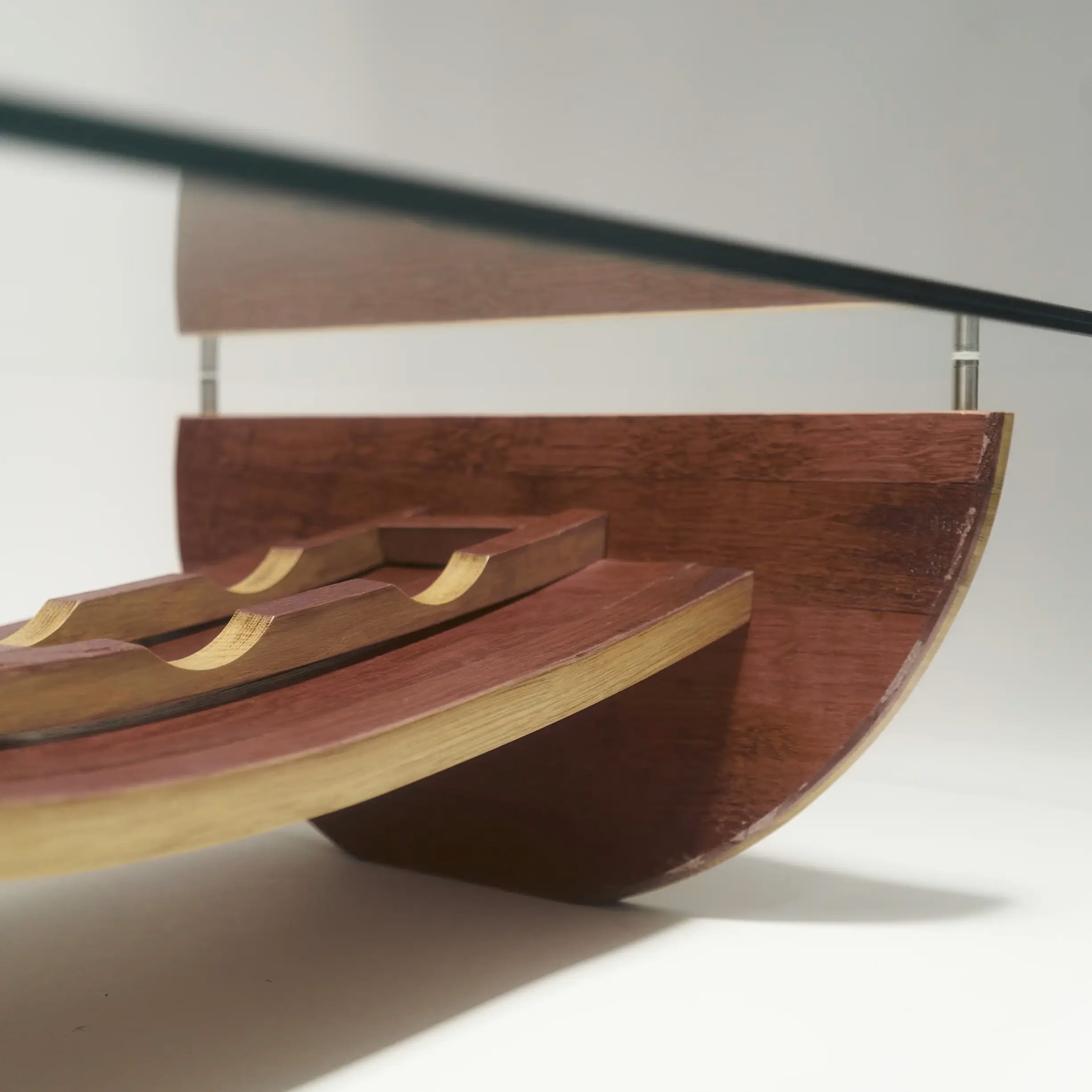 Canai è una tavolino da caffè in cui le gambe semicircolari, ricavate da coperchi di botti di vino recuperate, si fondono senza soluzione di continuità con la struttura concava delle doghe, svelando apertamente gli splendori nascosti dell’invecchiamento del vino sul rovere e fornendo al contempo un robusto supporto per il piano in vetro.