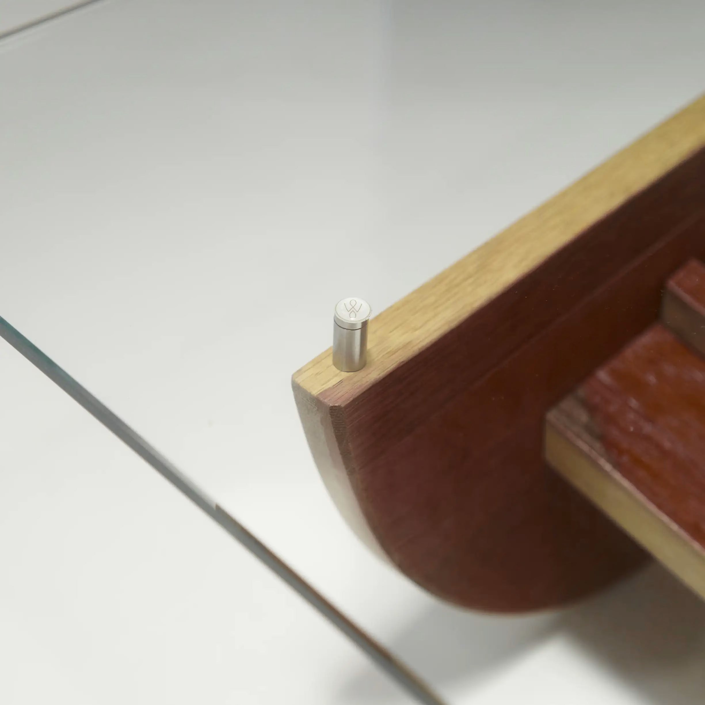 Piano in vetro extra-chiaro: Superficie resistente in cristallo temperato trasparente che valorizza le venature e i colori unici del legno sottostante.