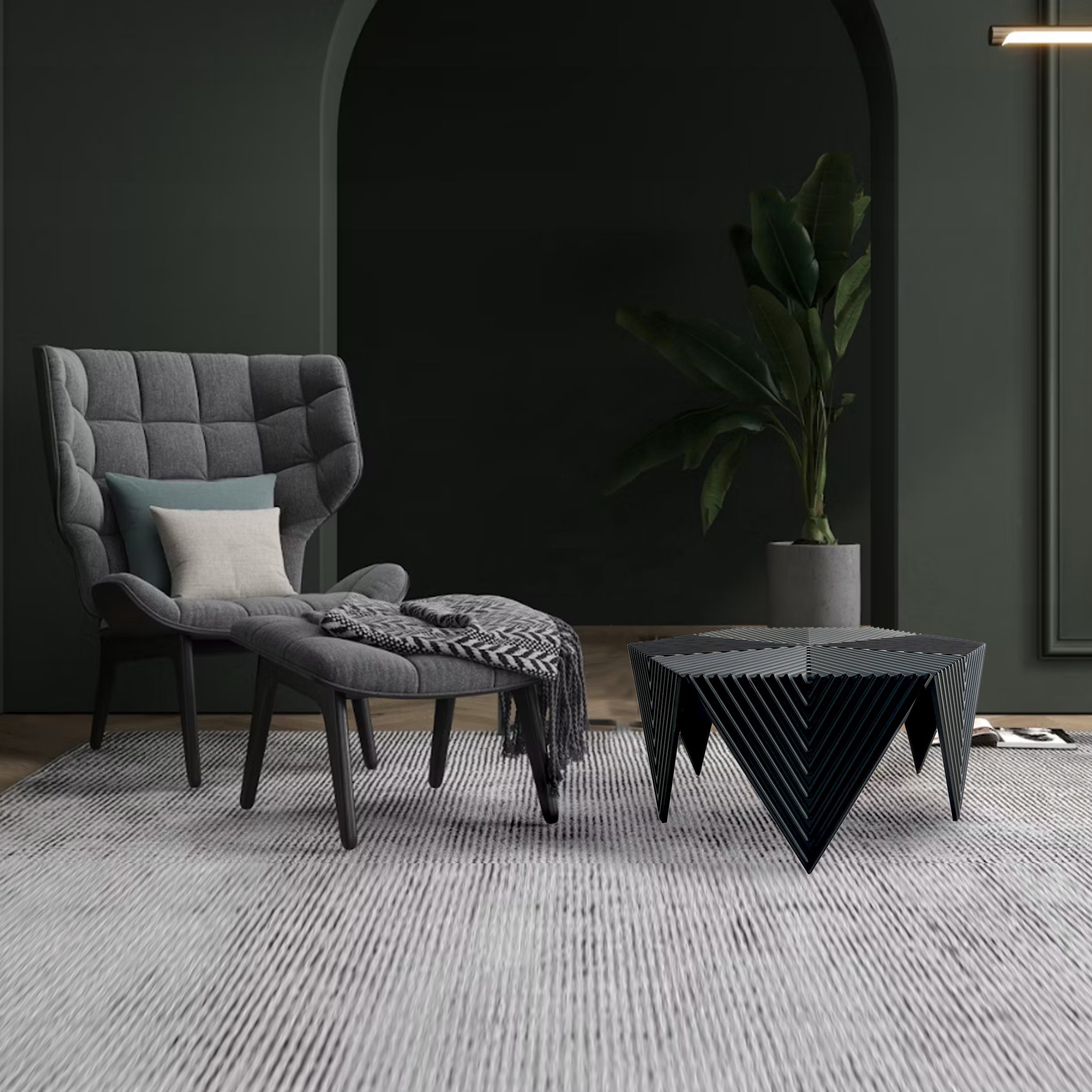 Il prodotto è realizzato interamente in MDF da 16 mm di spessore, lavorato tramite fresatura a controllo numerico per ottimizzare tempi e precisione di produzione. Il side table è composto da due elementi geometrici esagonali, uno utilizzato come piano d’appoggio, l’altro suddiviso in spicchi per formare la struttura dei piedi. Per la finitura è stata adottata una laccatura satinata.