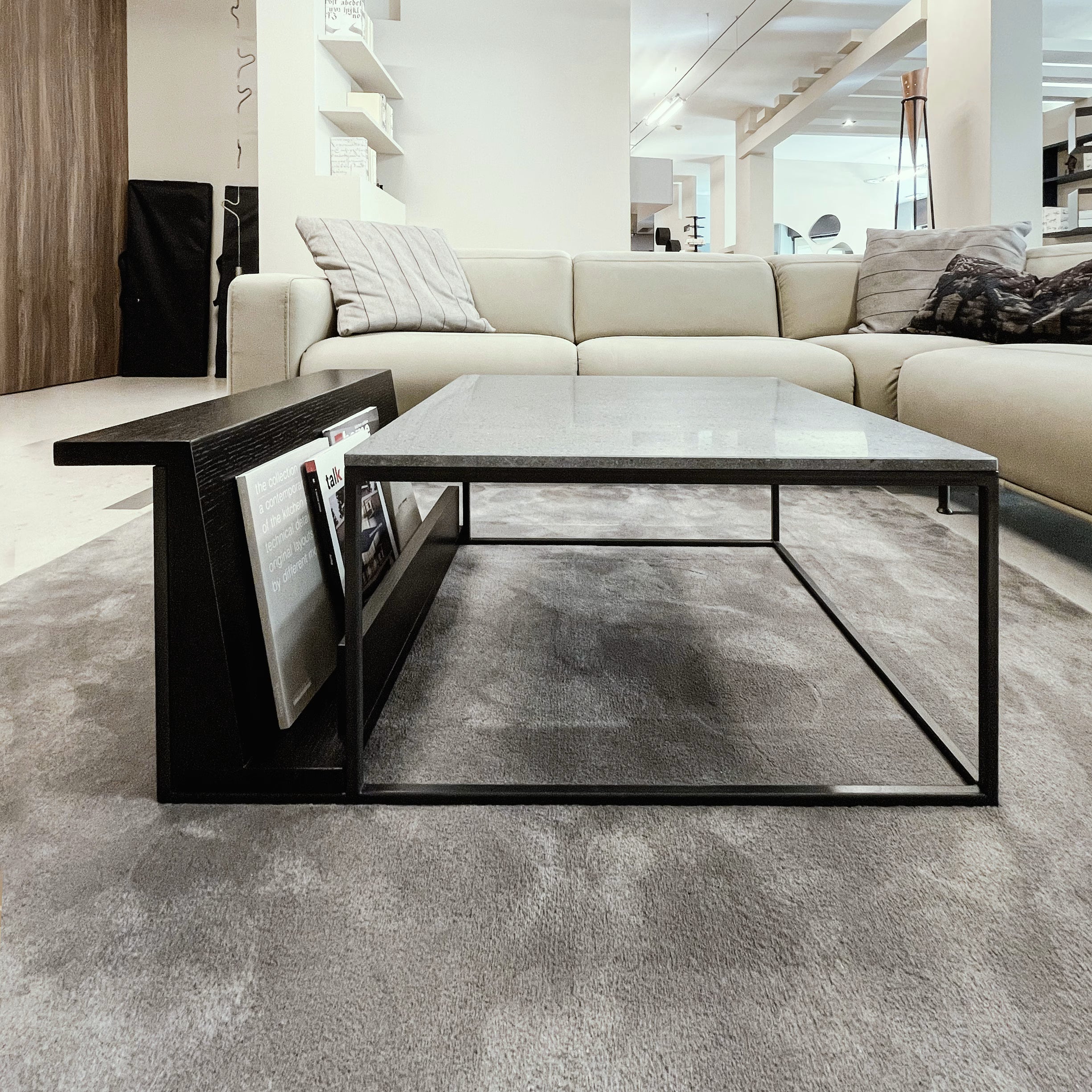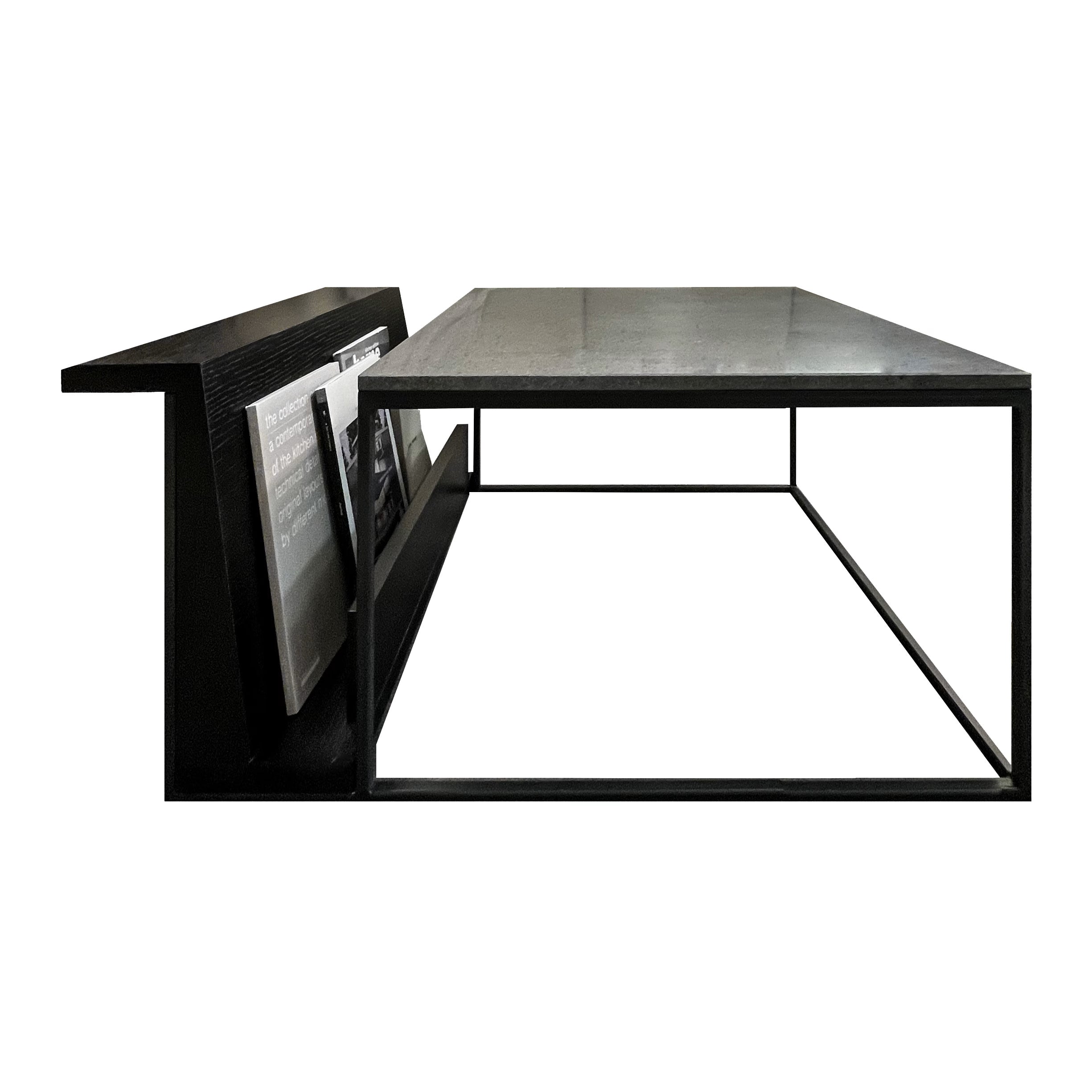 Slitta è un tavolo da salotto dalla struttura solida in acciaio verniciato e un piano in marmo, progettata con una duplice funzione: sostenere il piano in marmo e accogliere un portariviste in rovere.