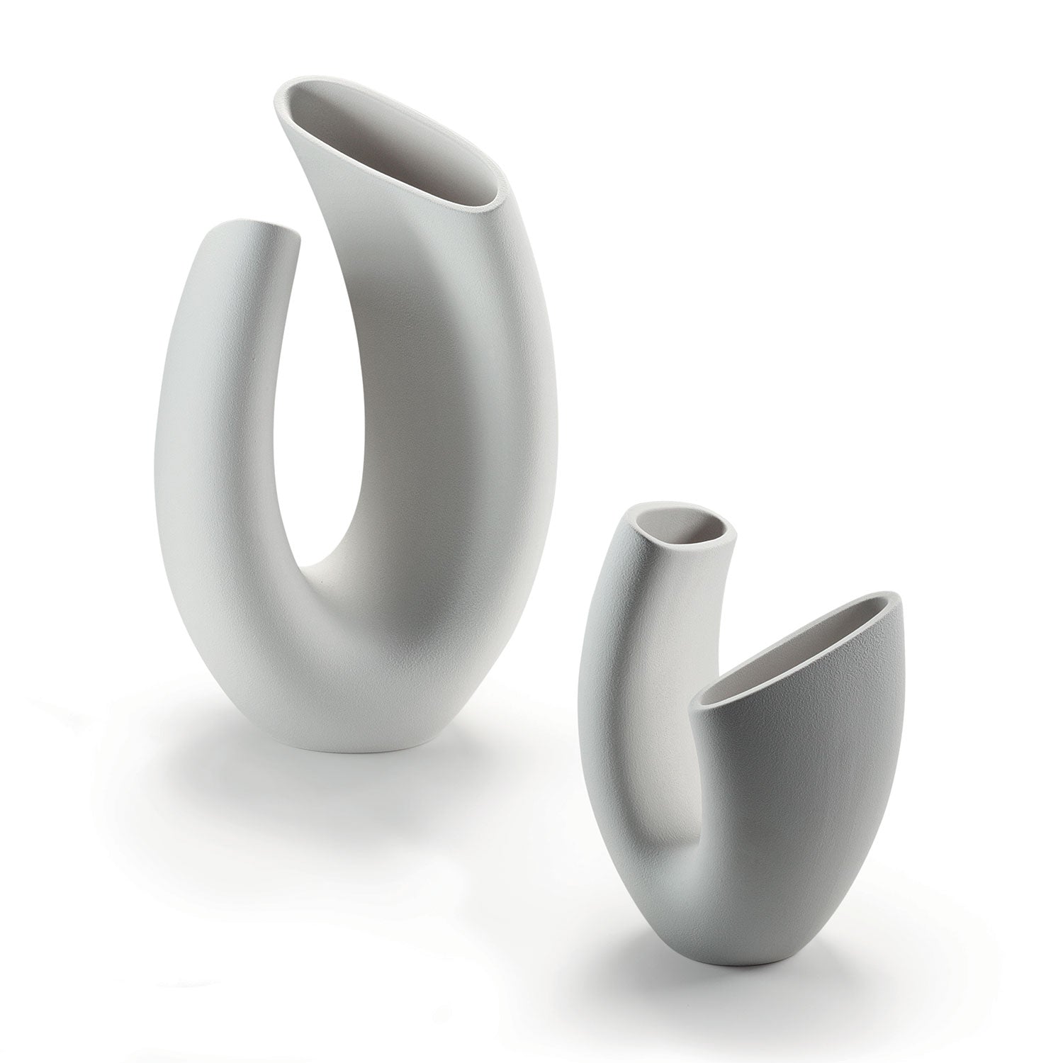 In questo vaso dalla doppia bocca, il designer ha voluto rappresentare la coppia in costante dialogo e relazione reciproca. La forza immediata di questo messaggio e l’equilibrio dinamico delle forme hanno contribuito a fare di questa opera una icona di Lineasette.